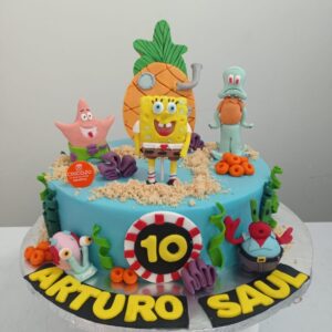 Este pastel se elaboró con los personajes de la caricatura de Bon Esponja hechos en fondant. La cubierta es de crema de queso.