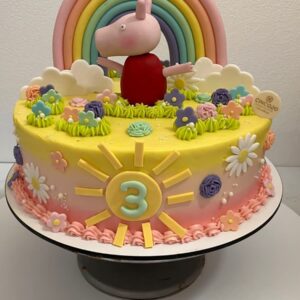 Pastel para 20 personas decorado con motivos del personaje Pepa Pig. Elementos con duya, crema de queso y fondant.
